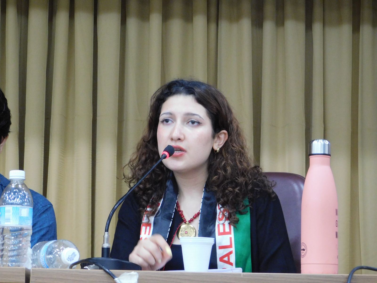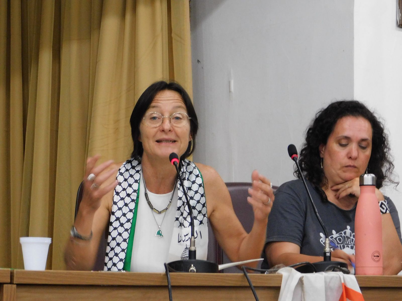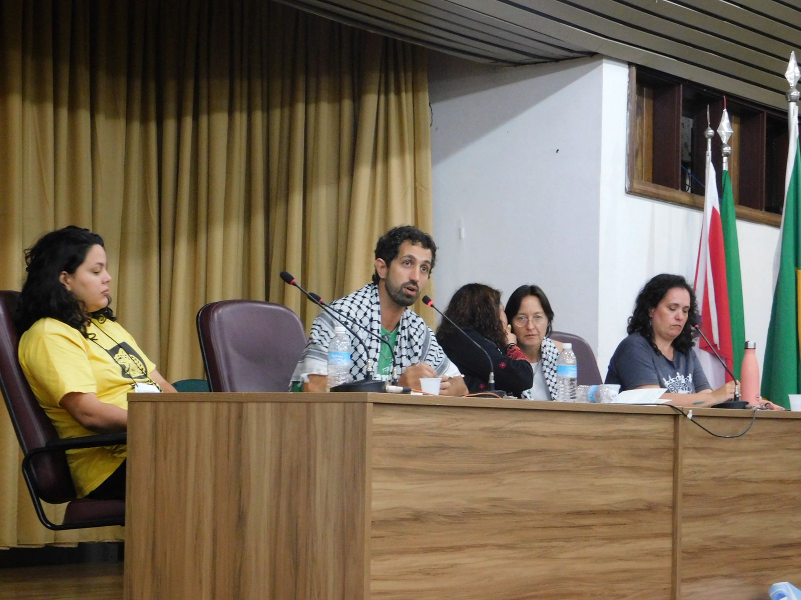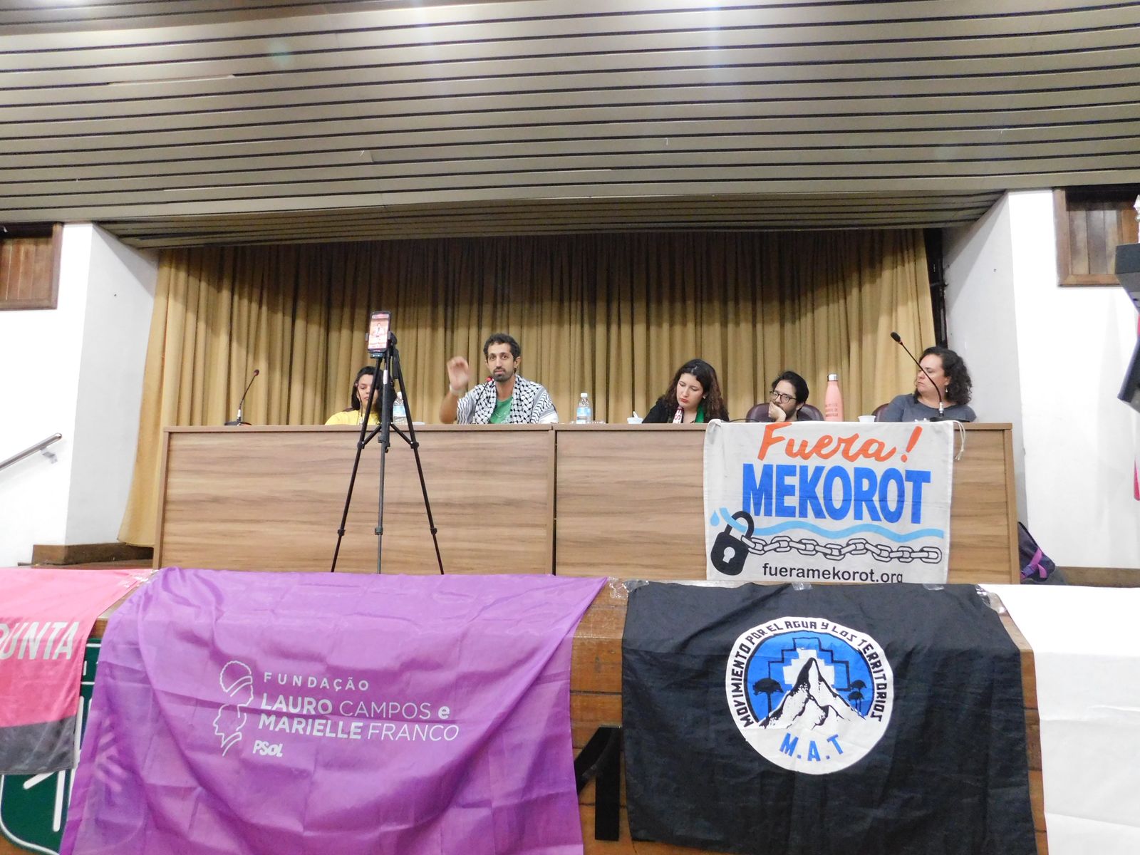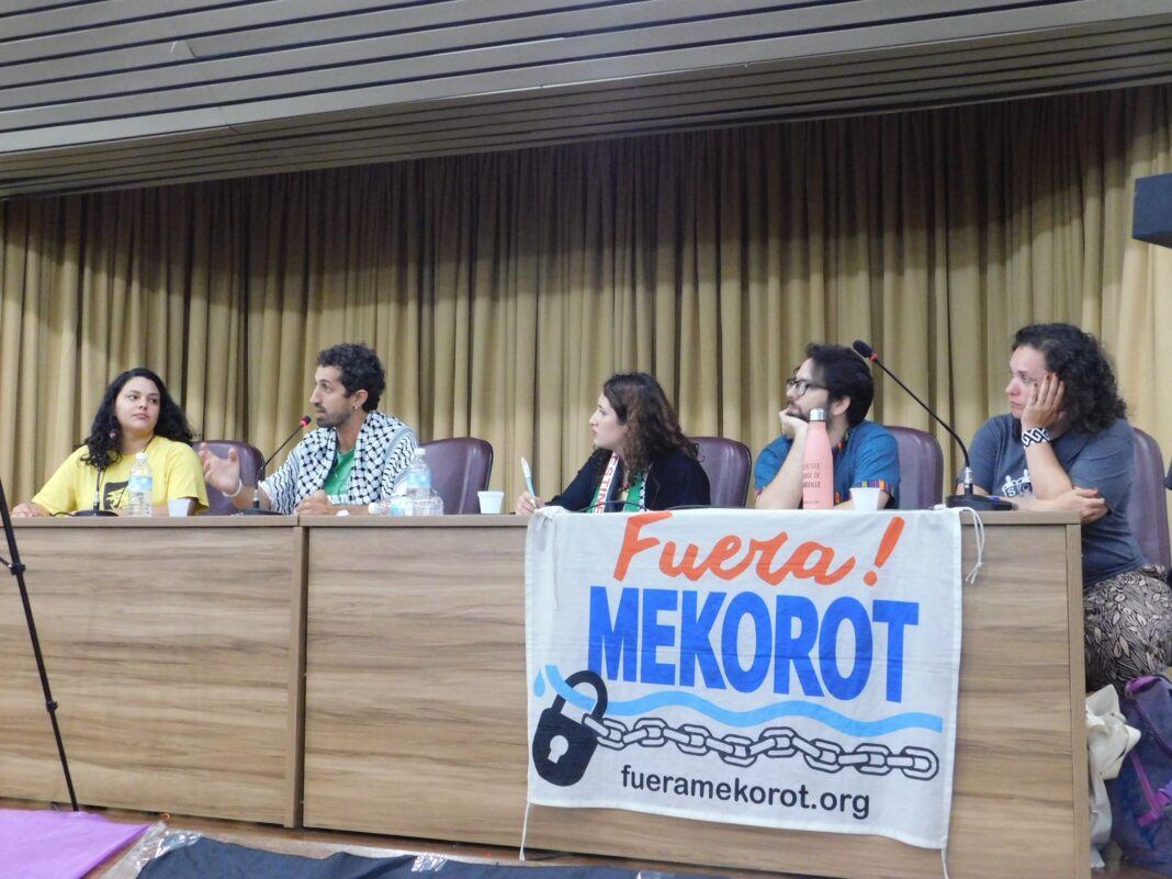 O ato simbólico contou com a presença de Jamal Juma, histórico ativista palestino do movimento BDS. Em seguida, a oficina teve a participação de Nico Calabrese, militante do PSOL e da Rede Emancipa que esteve na missão humanitária Global Sumud Flotilha; Maren Mantovani, do Secretariado do Movimento BDS e da campanha Fora Mekorot; Salma Barakat, coordenadora da Coalizão Palestina na COP30 e integrante do movimento Stop The Wall; Natalia Salvatico, da Amigos de la Tierra Argentina e da campanha Fora Mekorot; e Ian Vidal, do Attac na França. A mediação foi feita por Camila Barbosa, do coletivo Juntos!